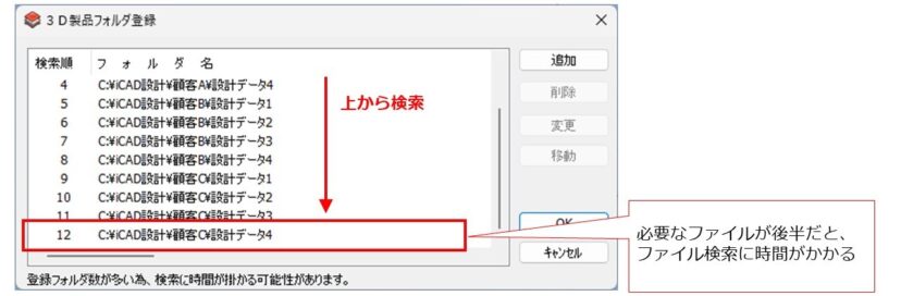 本ツールでは、「特定のファイルを開く際に優先すべきフォルダ」をあらかじめ設定しておくことで、対象フォルダを3D製品フォルダーの上位に自動配置します。これにより、外部パーツの検索時間を短縮し、ファイルの読み込みを高速化します。