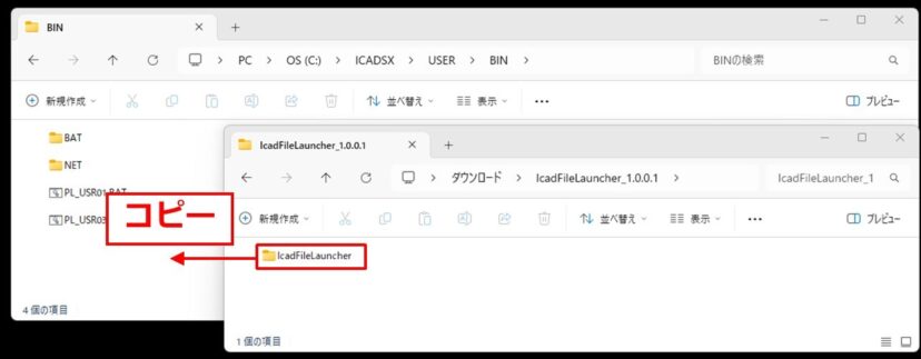 2. IcadFileLauncherフォルダをiCADインストールフォルダ\USER\BINへコピー