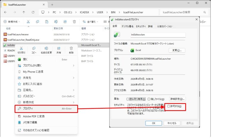 フォルダー内のIniEditor.xlsmを右クリックし、「プロパティ」を選択し、「全般」タブの「セキュリティ」の項目にある「ブロックの解除」にチェックを入れて、「OK」をクリックしてください。
