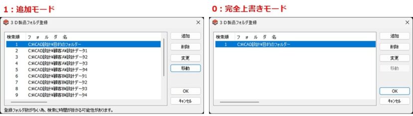 3D製品フォルダーのリストの追加方法を設定します。 “0”にすると完全上書きモードとなります。既存内容をすべて無視し、一致したフォルダのみ書き込みます。 “1”にすると追加モードとなります。既存内容は保持し、一致フォルダを先頭へ挿入します。既存するフォルダを追加する場合は、重複防止のため、挿入前に削除されます。